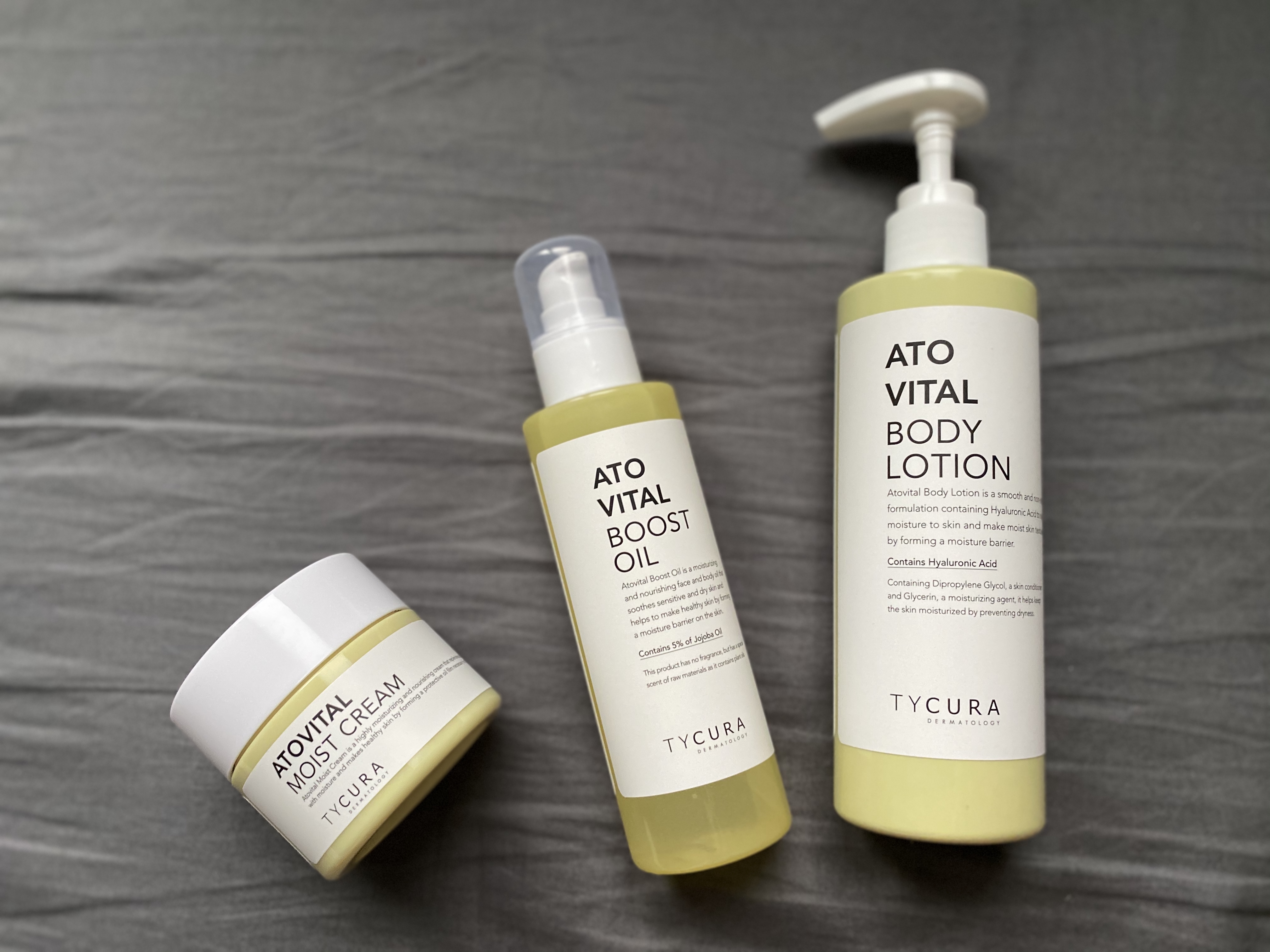 티큐라의 보습라인 아토바이탈은 바디로션, 바디오일, 크림 총 3개 제품으로 구성되어 있는데요.